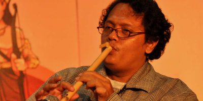 Tun Channareth, the recipient of the Nobel Peace Prize in 1997, interviewing Phanna on stage in front of a large audience. Ban landmines campaign (JRS Cambodia)